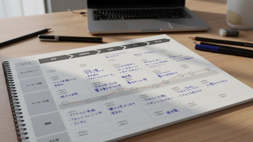 カスタマージャーニーマップとは、顧客が商品やサービスを認知してから購入・利用に至るまでの一連のプロセスを時系列で可視化したフレームワークです。顧客の行動だけでなく、各段階における思考や感情、接触するチャネルなども含めて図式化します。